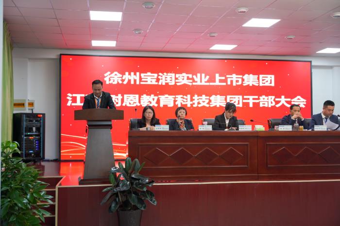 2020年10月10日,徐州宝润实业上市集团、江苏树恩教育科技集团干部大会在徐州市树恩外国语小学举行。徐州宝润实业上市集团董事局主席、董事长张爱平出席会议并作重要讲话。集团董事局成员及下属产业集团经营团队、职能部门主要负责人参加会议。